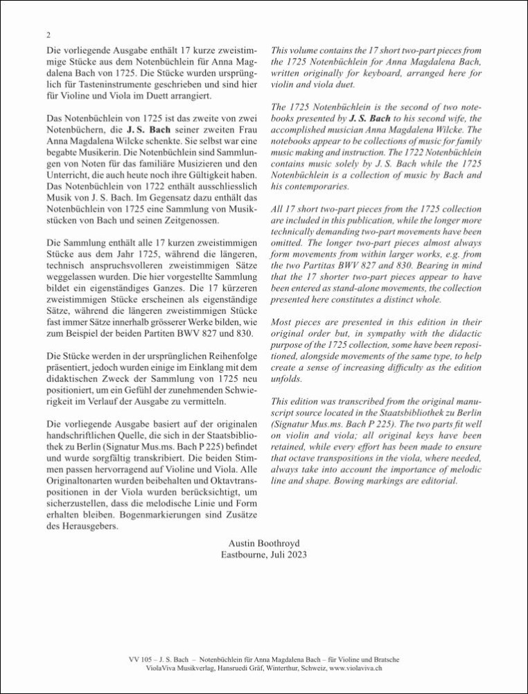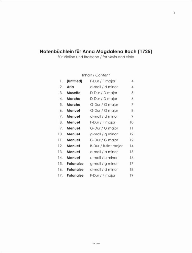 Notenbüchlein für Anna Magdalena Bach (1725), arrangiert für Violine und Bratsche