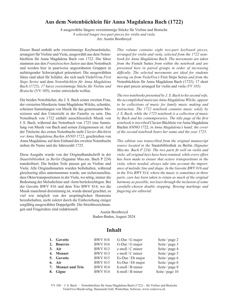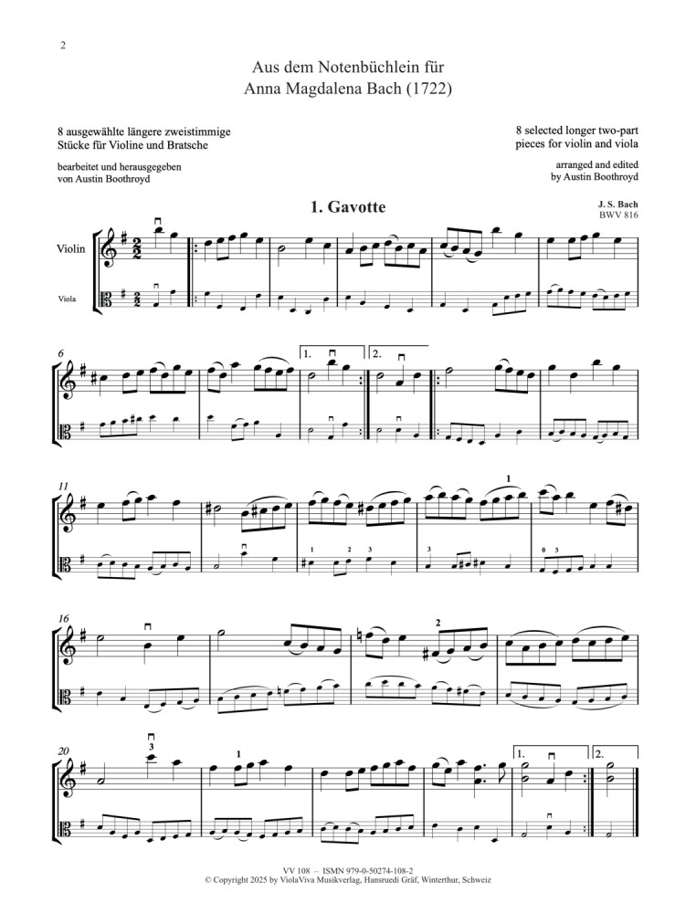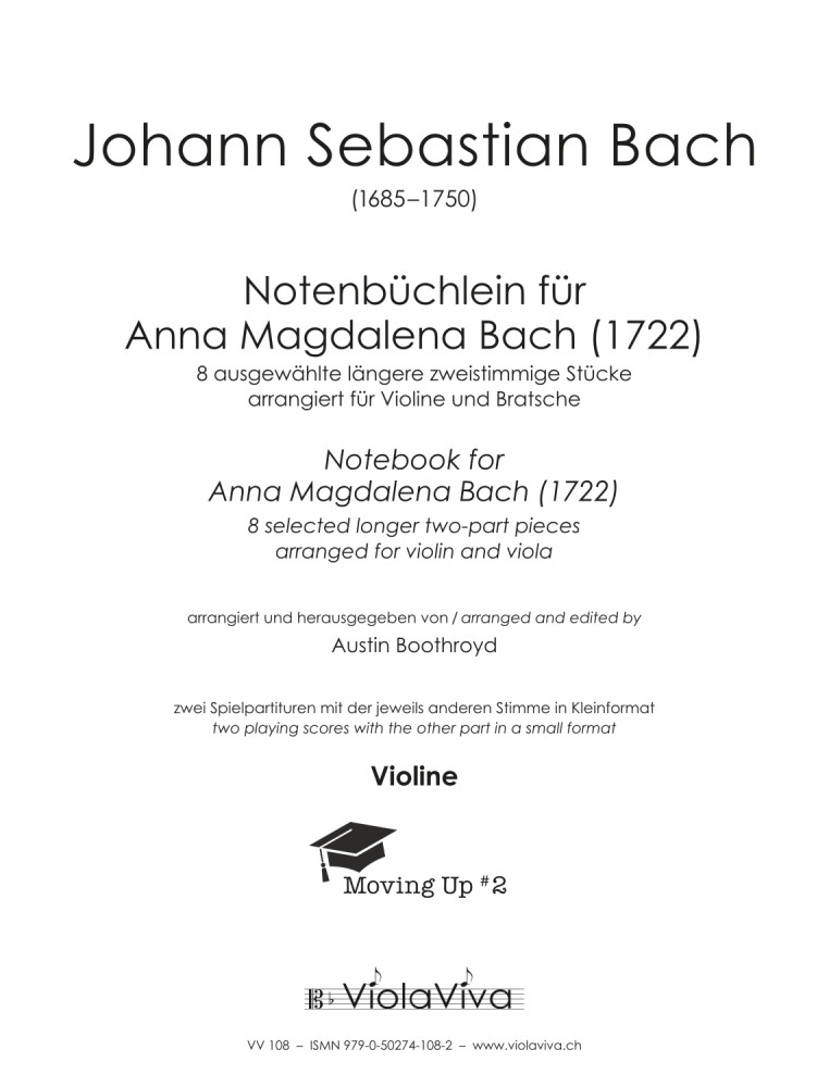 8 ausgewählte längere zweistimmige Stücke 2 Spielpartituren - die jeweils andere Stimme in Kleindruck https://music4viola.info/werk-info/91/Bach%20J.s./notenbuechlein-fuer-anna-magdalena-bach-1722-fuer-violine-und-bratsche